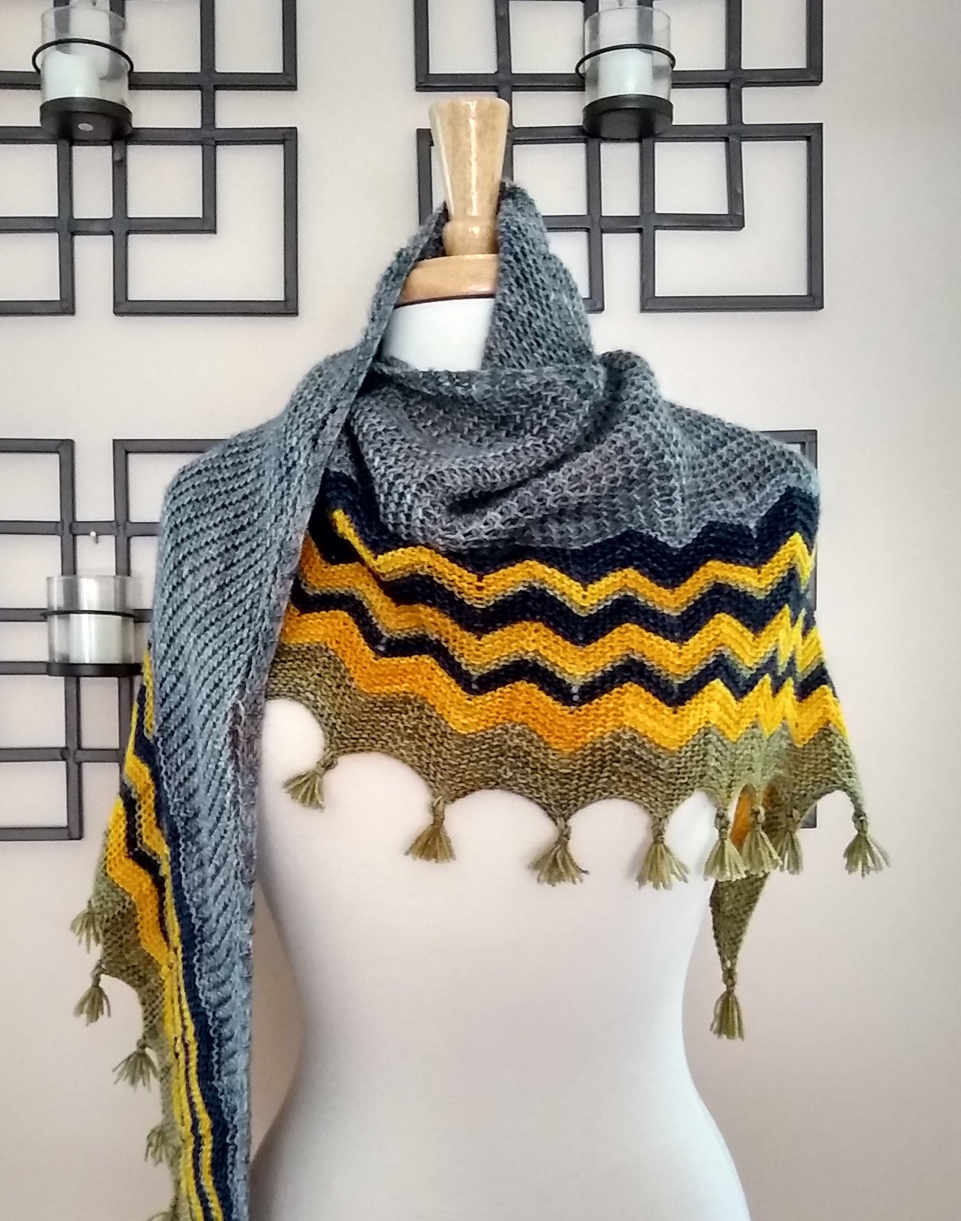 Inspired by the beautiful Catalina Mountains in Tucson, Arizona, this shawl features a bold chevron border representing the proud mountain peaks below a lacy open stitch pattern representing the open sky above. Optional tassels give the shawl a Southwest feel. The yarn colors I chose reflect the image I wanted to create: a smoky blue for the body of the shawl as the sky above the mountains, a deep navy blue for the dark clouds that sometimes cover the peaks, a bright yellow for the rays of sun that shine so brightly through the clouds, and a cactus green for the mountains covered with Saguaro cactus. Make this shawl completely your own by choosing colors and varying the stripes in the border to create the image you see in your own mind!