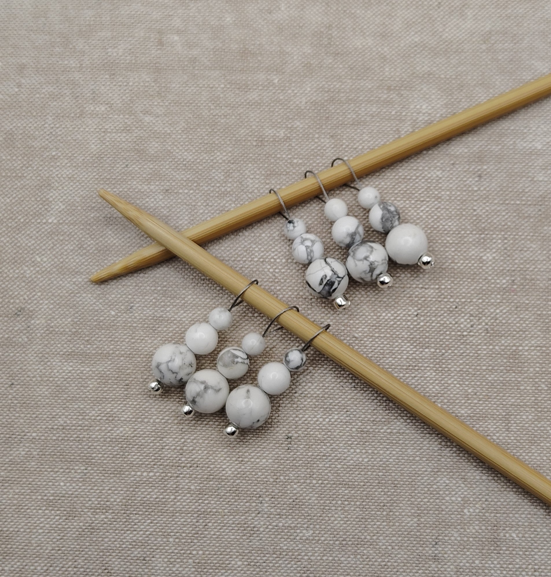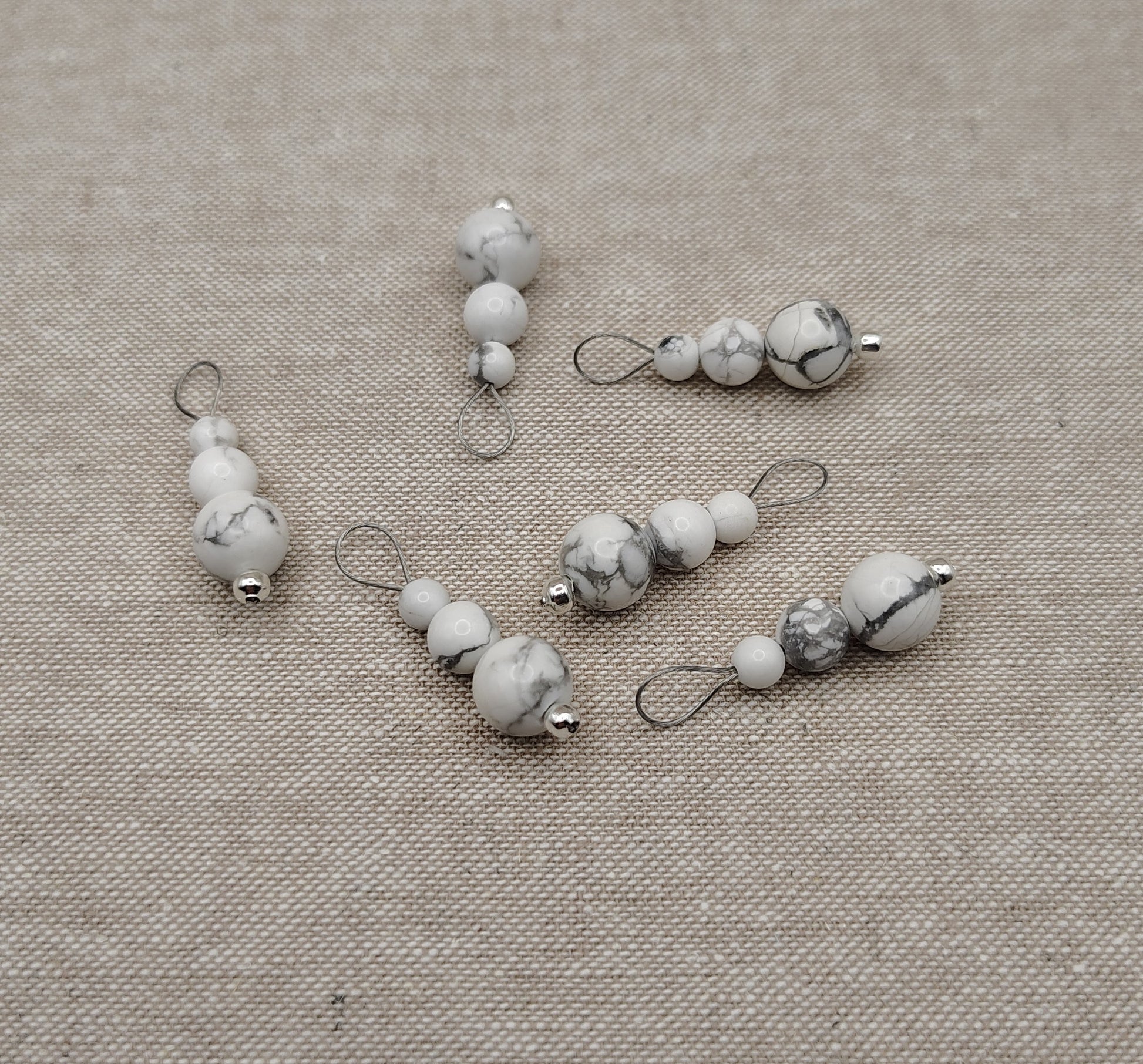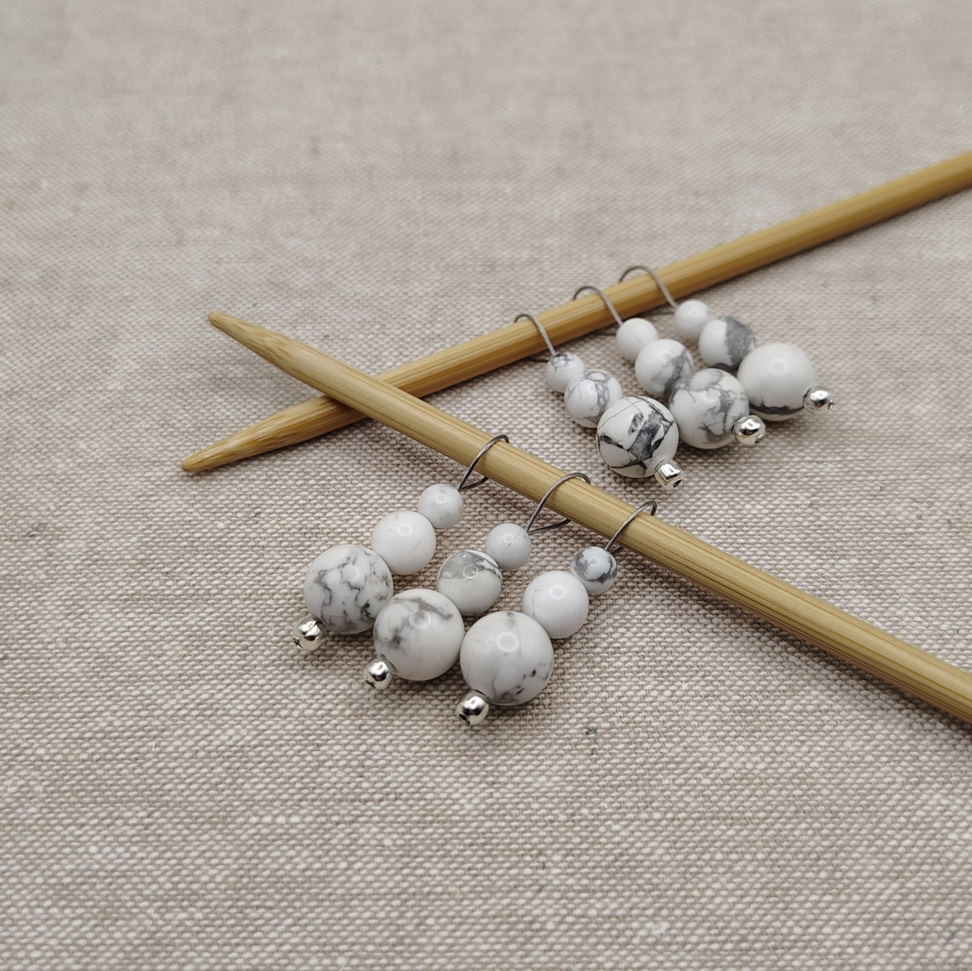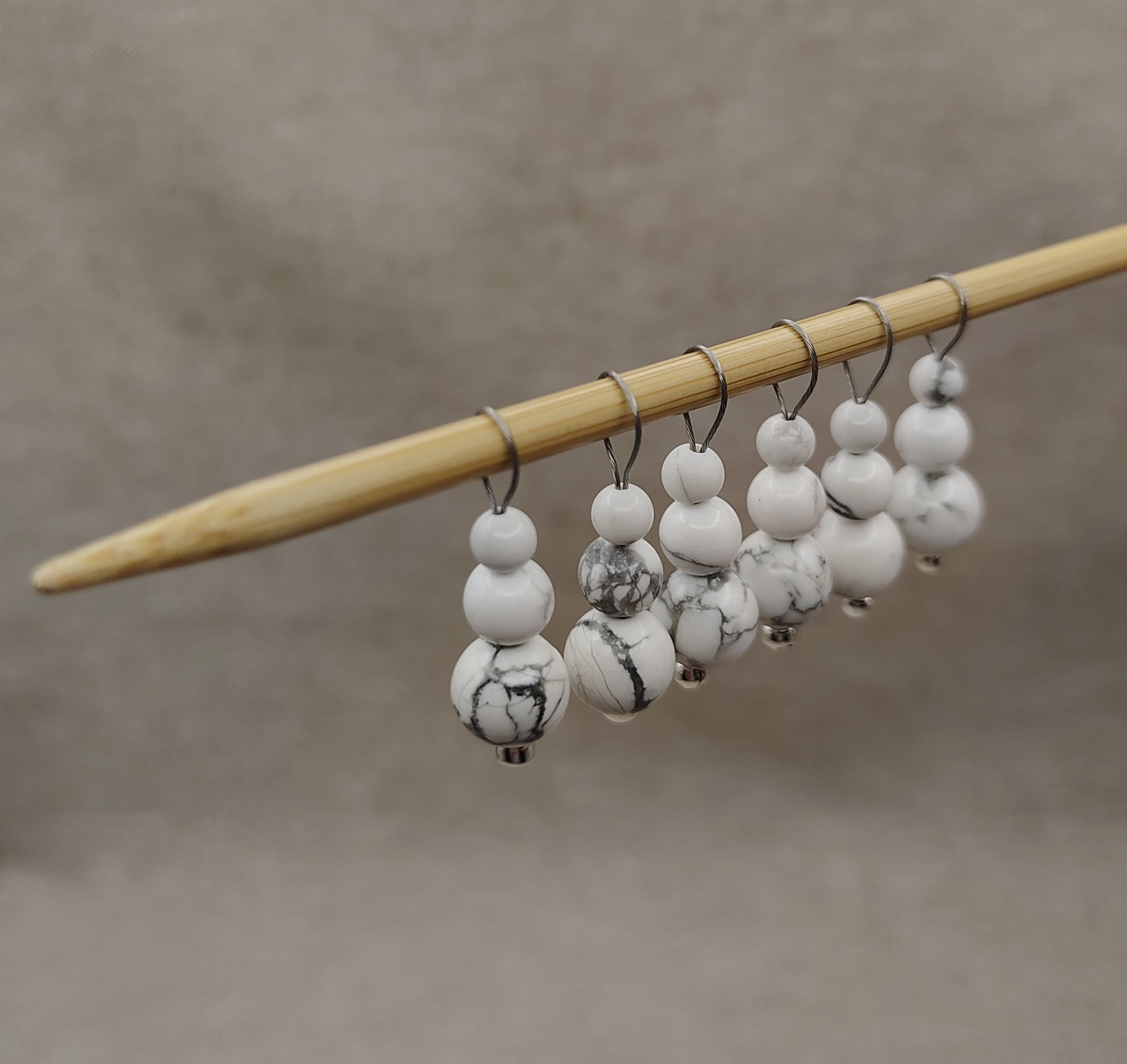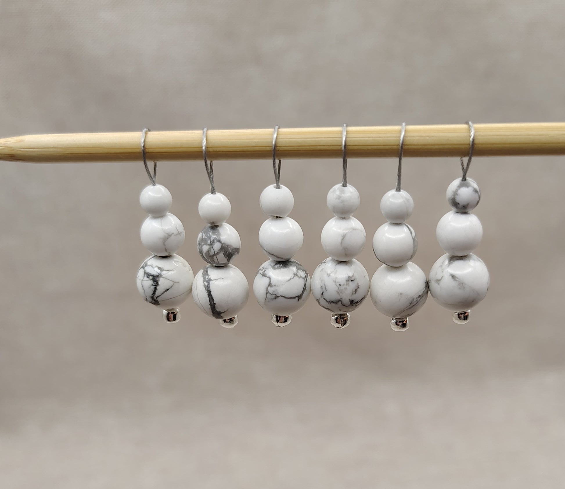 You will receive 6 markers made with 8, 6 and 4mm round howlite semi-precious stone beads stacked on top of each other (total height is about 17mm). Markers are made with silver flexible beading wire. They are like jewelry for your knitting needles!