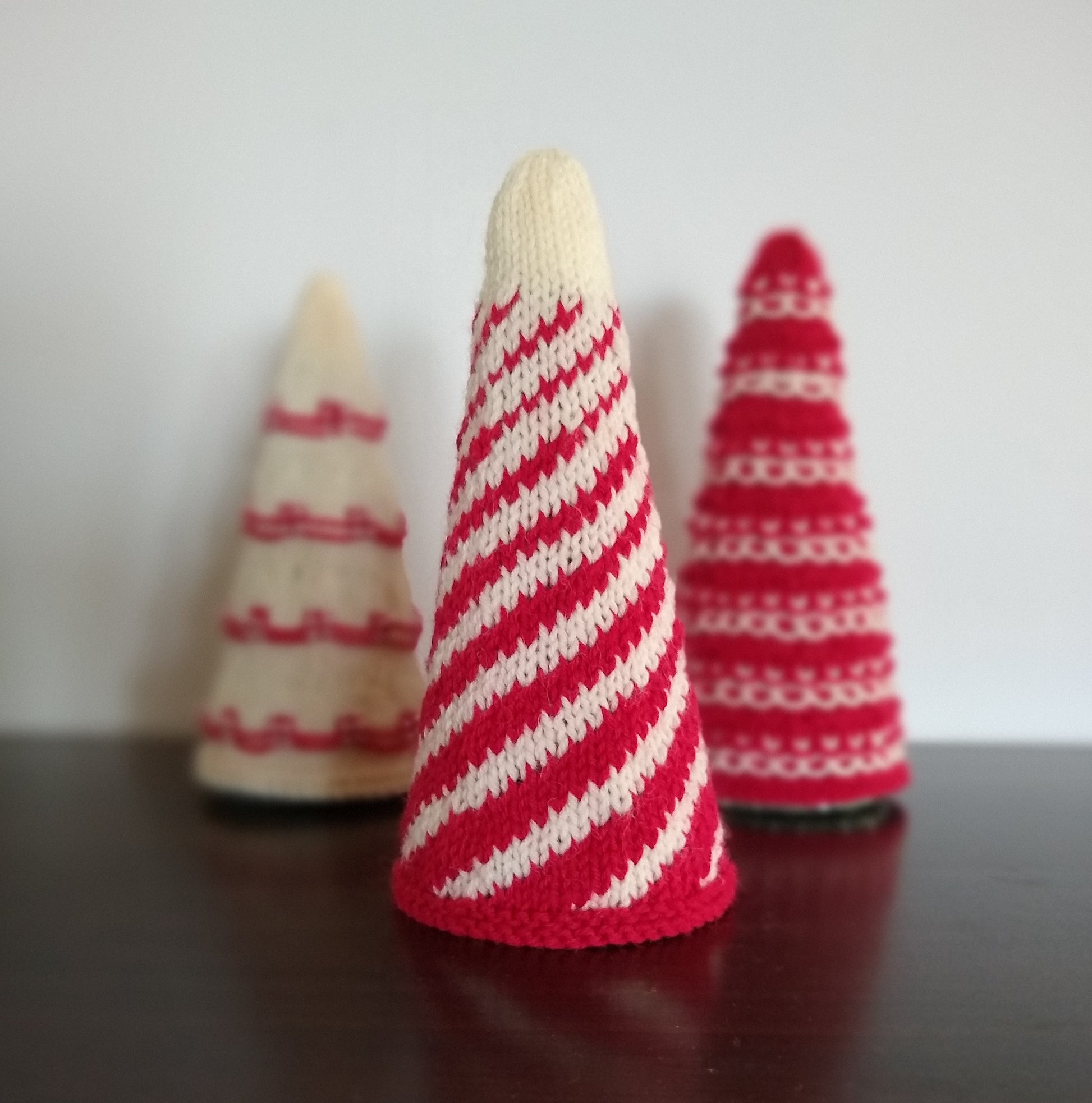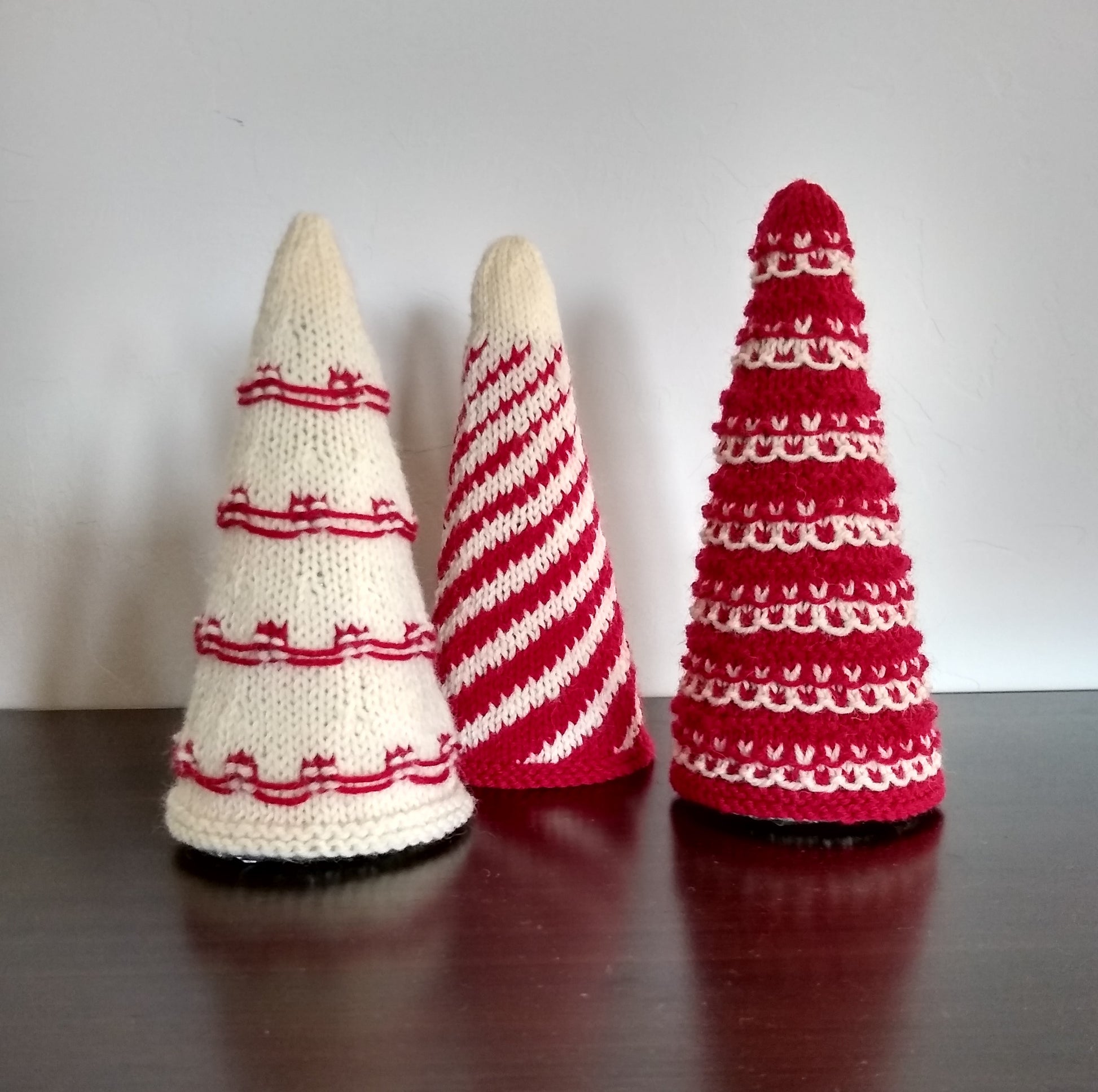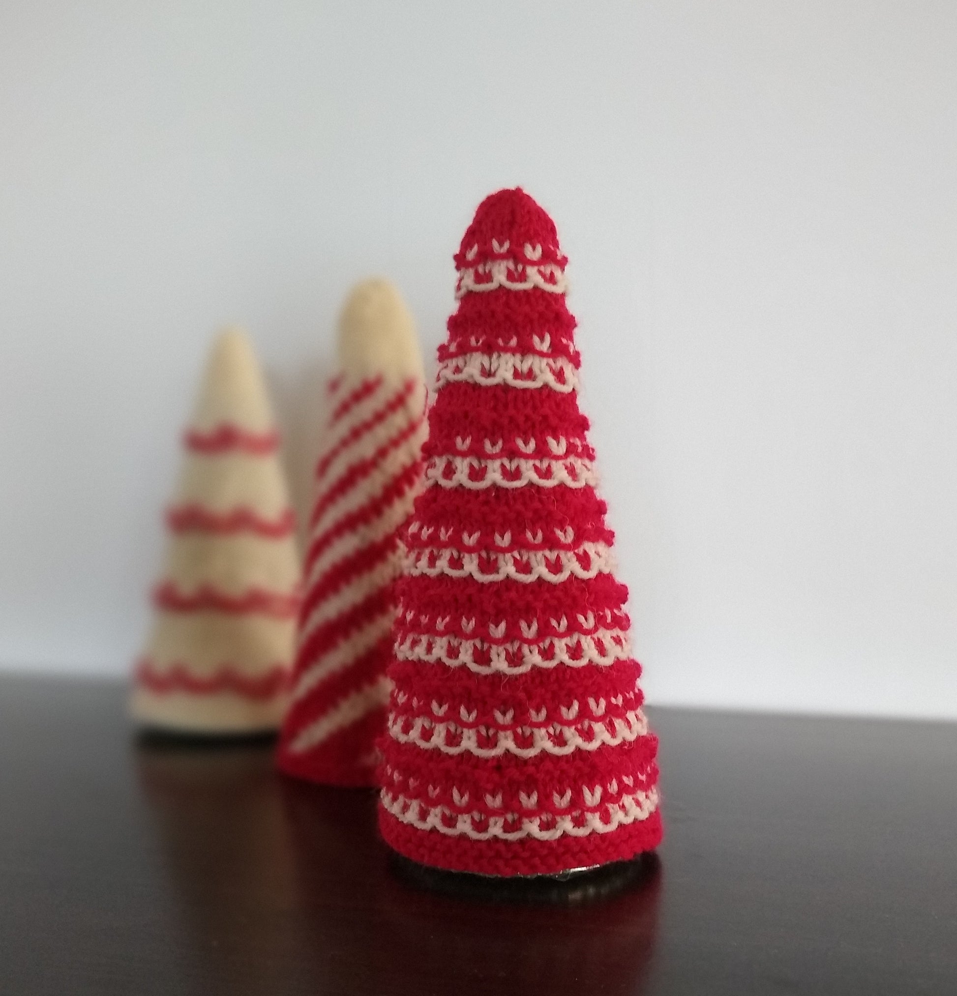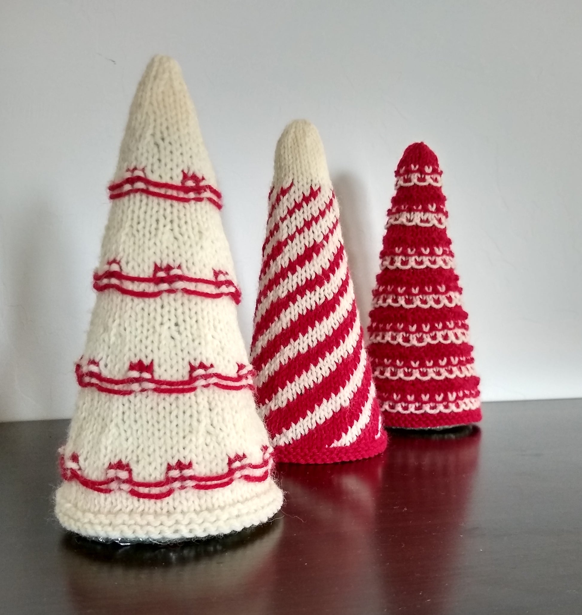 Tree cozies are knit in the round so there are no seams, and pop over styrofoam cones.
