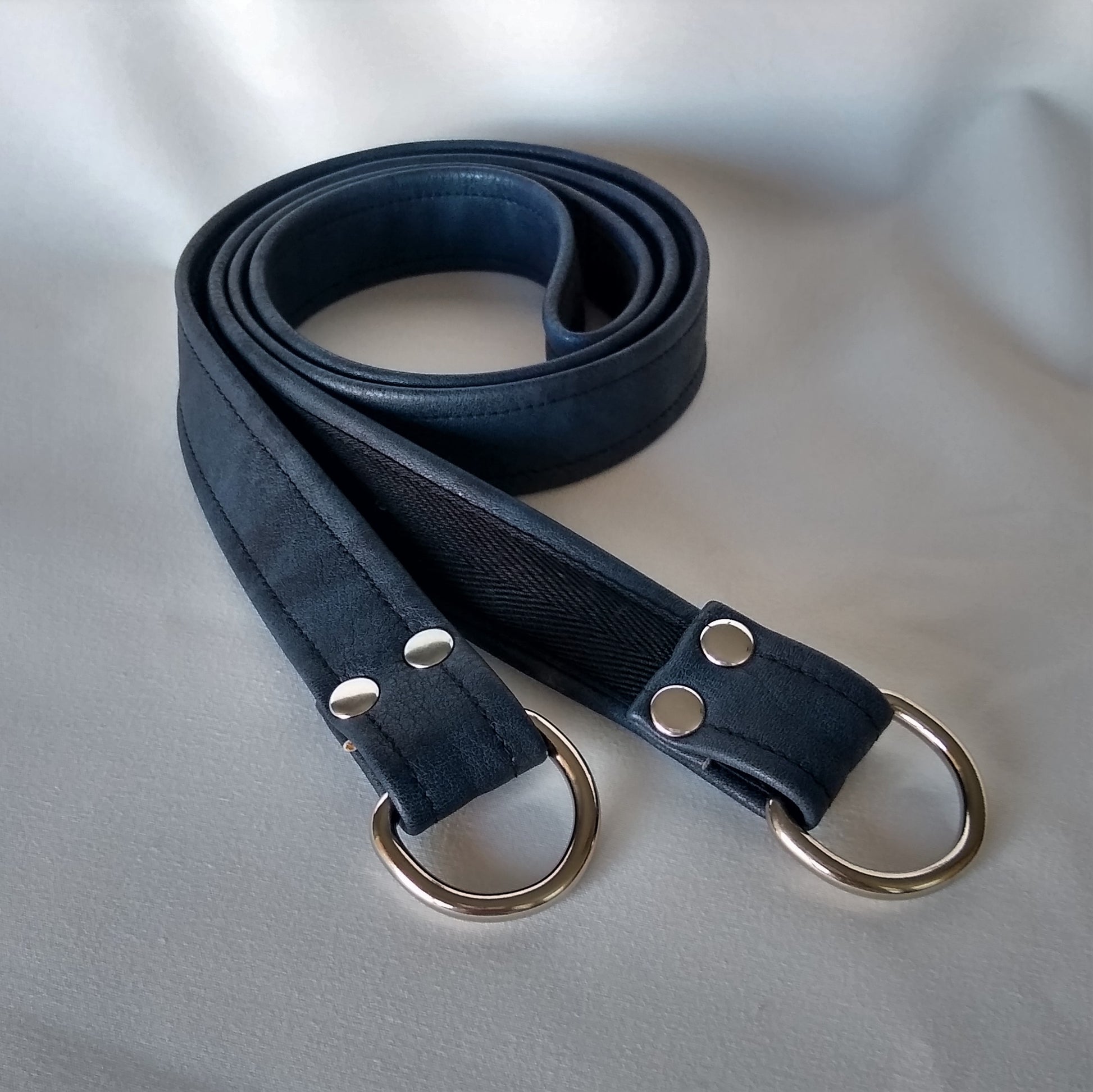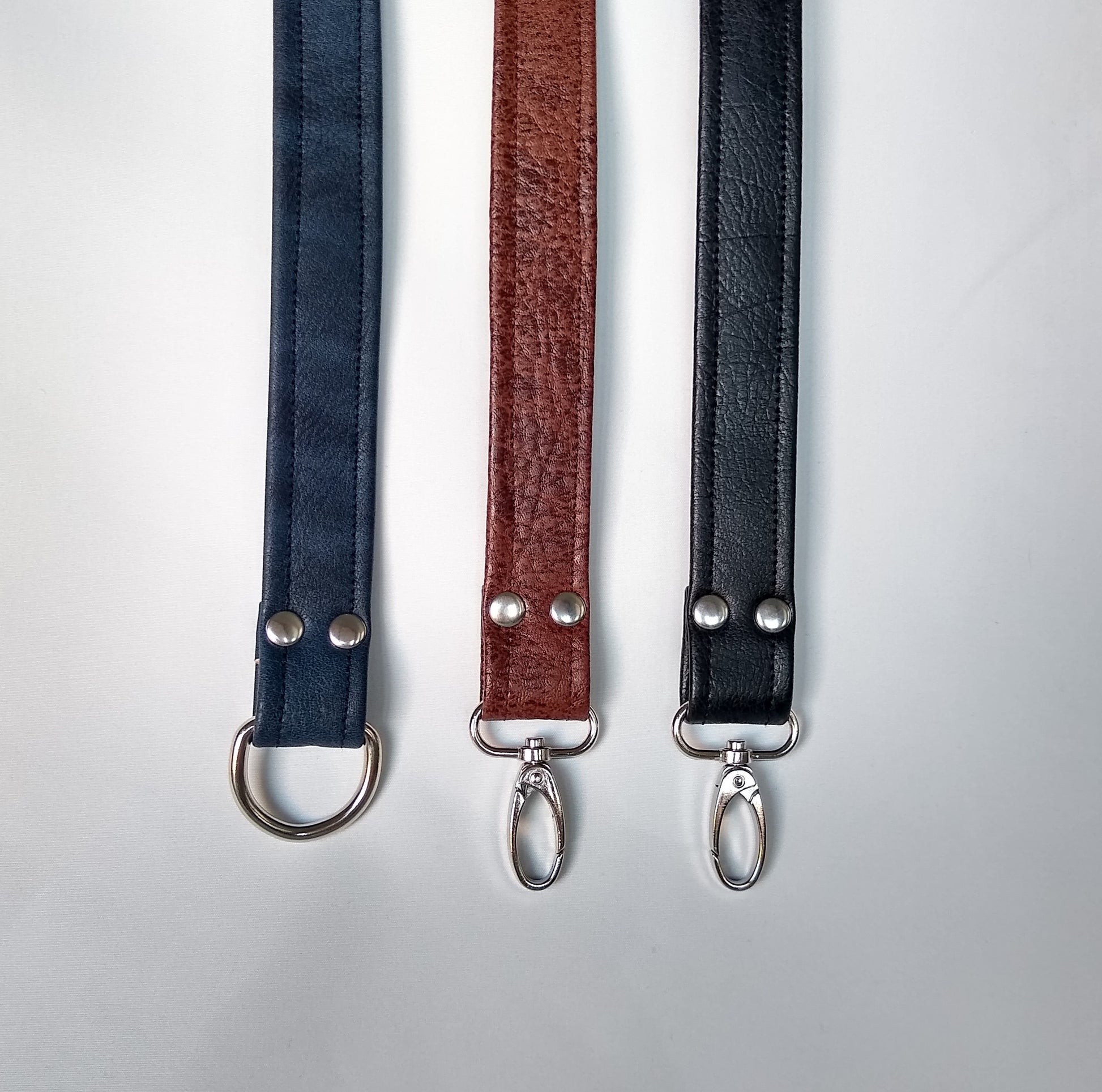 Straps come in either 24" or 48" lengths in deep navy with black mottling, distressed brown, and solid black, with your choice of swivel lobster claw clips or d-rings on each end. Clips and d-rings are silver metal. Back of straps are lined with cotton webbing. The 48" strap is sold INDIVIDUALLY, the 24" handles are sold as a PAIR. These straps are carefully hand crafted by me with attention to detail.
